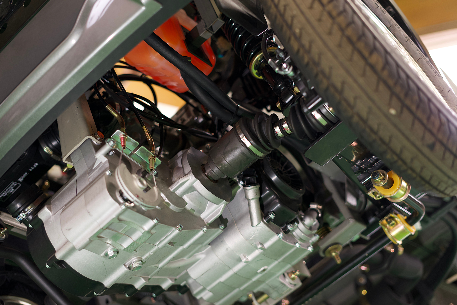 従来のプロペラシャフトを使用せず、エンジンから直接ドライブシャフトへと伝達する構造とすることで、メカニカルノイズを大幅に低減。加えて、エンジンをリアシート下に配置することで、静粛性をさらに高めています。